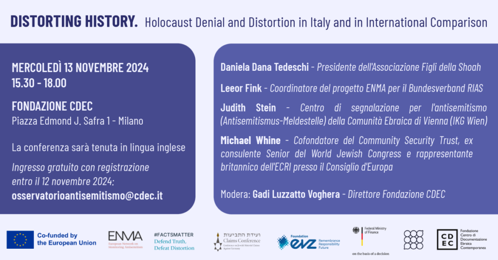 L’evento è organizzato dalla Fondazione Centro di Documentazione Ebraica Contemporanea CDEC, parte della Rete Europea di Monitoraggio sull’Antisemitismo (ENMA). L’iniziativa è finanziata nell’ambito del progetto Standardised Recording of Holocaust Distortion in Five European Countries, che dal giugno 2024 si sta occupando di sensibilizzazione sul negazionismo e sulla distorsione della Shoah sui social media attraverso la campagna #FACTSMATTER Defend Truth, Defeat Distortion. Per maggiori informazioni, visita il sito di ENMA.